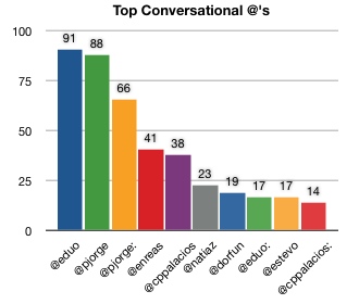 Tampoco me llevo sorpresas en esto. Eduo se lleva la primera posición, seguido de cerca por PJorge. También me valen para confirmar un error que cometía al principio, nunca escribas ningún carácter pegado al nombre de un usuario en twitter @nombre_usuario, Twitter no es capaz de distinguirlo.