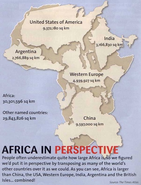 Ya sabía que el tamaño de los continentes que vemos en los mapa mundi esta incorrecto, tal y como nos muestra la Proyección de Peters. Lo que no sabía era cuanto de incorrecto, este esquema nos ayuda a saber lo grande que es Africa.